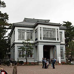 手前に張り出した両翼部を配した庁舎建築にも見える近代和風建築。 当初は日本勧業銀行本店として都内に建てられ、京成電鉄の施設や千葉市庁舎などに移築使用された後、昭和40年に現在地に移築されました。 現在は鉄筋コンクリートによる躯体に作り替えられています。 武田五一と妻木頼黄による設計。 HP |
