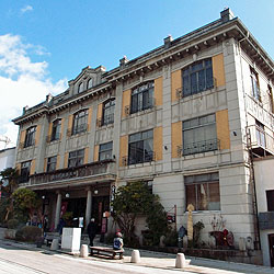 木造モルタル壁のモルタルを厚くして強度を持たせた、鉄網コンクリート造の旧旅館。 軒上にパラペットを巡らせ、出入口直上にはステンドグラスをはめ込んだアーチ窓。 2・3階の窓周りにはタイルを貼り、3階は緩いアーチ窓。 門前通り拡幅で建て替えられ、現在はレストランや婚礼会場として使われています。 HP |