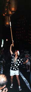 を回ったり、引き手に飲み物を配ったり、といろいろな経験ができました。 約20の町内会が歴史上の場面を人形などで飾った山 車をそれぞれ作り、笛や太鼓のお囃子にのってユカタ姿で街中を引いて回り、ところどころで停まって踊りを披露する数百年来のお祭り です。 20日は比較的おとなしく、21日の昼から徐々に激しさを増してきて、20:30ごろから翌1:00過ぎまでの「戻り山」で最高潮に達します。 戻り山の引き手は中学生から20代前半なので、ついていくの は結構キツいです。 土崎(秋田市内の港町)の人は祭りを中心に1年が回るというほどらしく、去年に続いて2度目の私も、秋田 を離れても祭りに来てしまいそうなぐらい楽しめました。 |