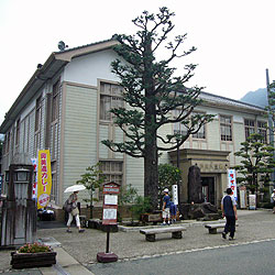 外壁は横羽目板を基本に、基部はスクラッチタイル貼りの建物で、1・2階の窓を連続的に見せるデザインになっています。 正面中央に小ぶりな玄関ポーチがありますが、左右対称ではなく、川に面した左側だけ前方に張り出しています。 現在は、物産館や観光案内所として使われています。 HP |