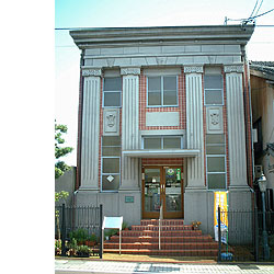 建物正面は、イオニア式(渦巻き式:こちらは角々ですが)の柱頭の列柱4本が伸びています。 小振りながら営業室は吹き抜けで、北向きの正面から適度な光が差し込みます。 天井など内部はシンプルながら、回廊が3方に付いているのが律儀。 国道1号線の旧道の旧道(元の東海道?)沿いに建っています。 HP |
