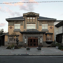 モルタル塗で洋風を醸し出す旧日本旅館。 窓周りには装飾が施され、菱形のワンポイントが光るベージュ色と2色のモルタルで、軽快な雰囲気に仕上げています。 外観とはうらはらに、ガラス戸の外から見る限り日本旅館のようでしたが、右側1階の出窓部分だけは洋間のようでした。 現在は結婚式場として転活用。 HP | ||||